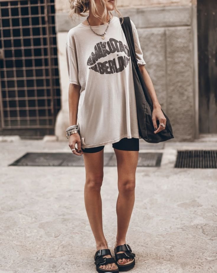 Pair a vintage band tee with tight biker shorts and high-top sneakers.