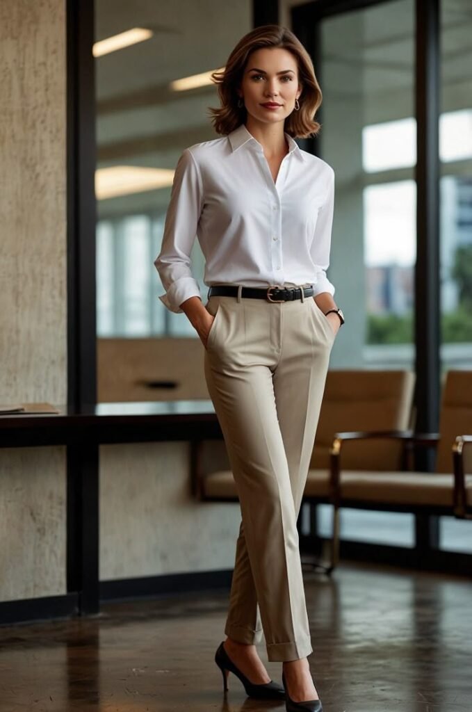 2. The Classic White Shirt + High-Waisted Trousers Combo