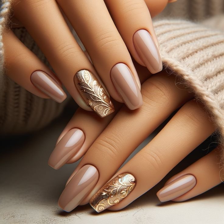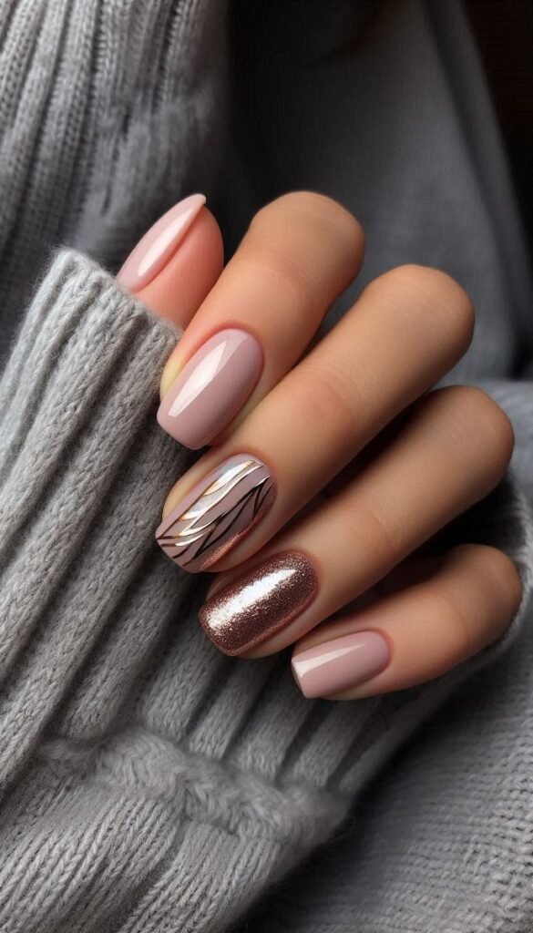 Add a dash of drama with metallic stripes or dots over a nude base. Gold leaf flakes or holographic foil create a luxe contrast against understated tones.