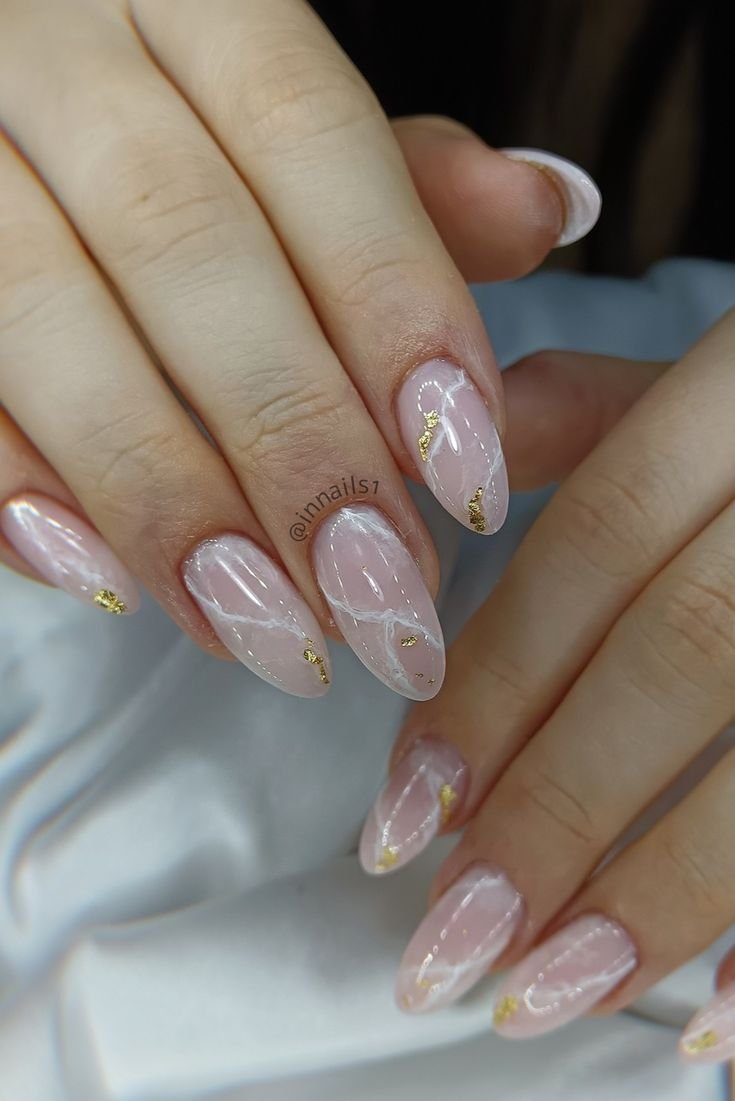 Create a marble effect using nude, white, and gray polishes. Swirl the colors with a toothpick or dotting tool while the base is still wet.