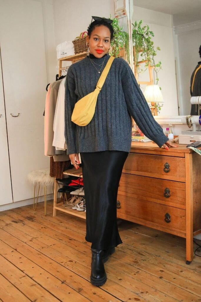 Oversized knits are fall staples, and they pair beautifully with pleated or satin midi skirts. It’s a great mix of slouchy and polished. Tuck the front of the sweater slightly into the waistband to define your shape.