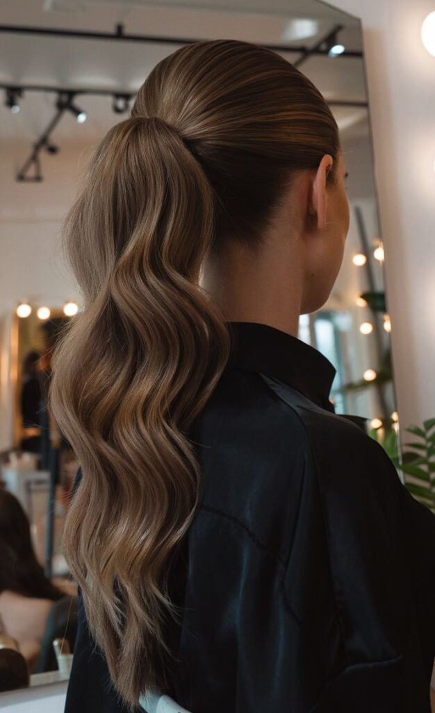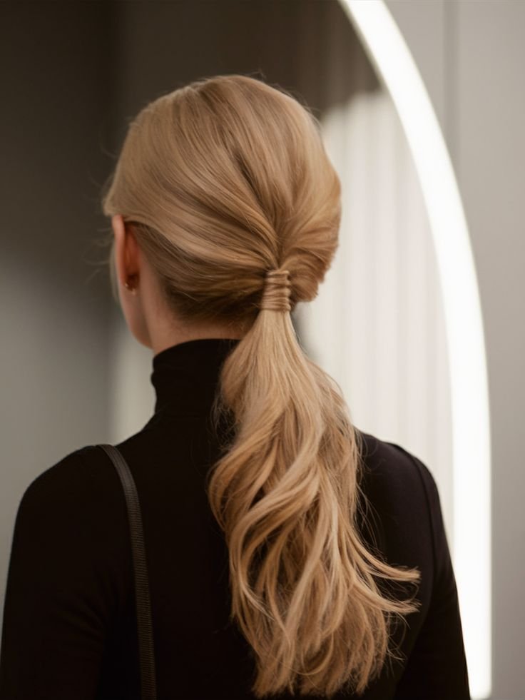 The sleek low ponytail never fails. Straighten your hair and secure it at the nape. Add shine serum for a polished look.