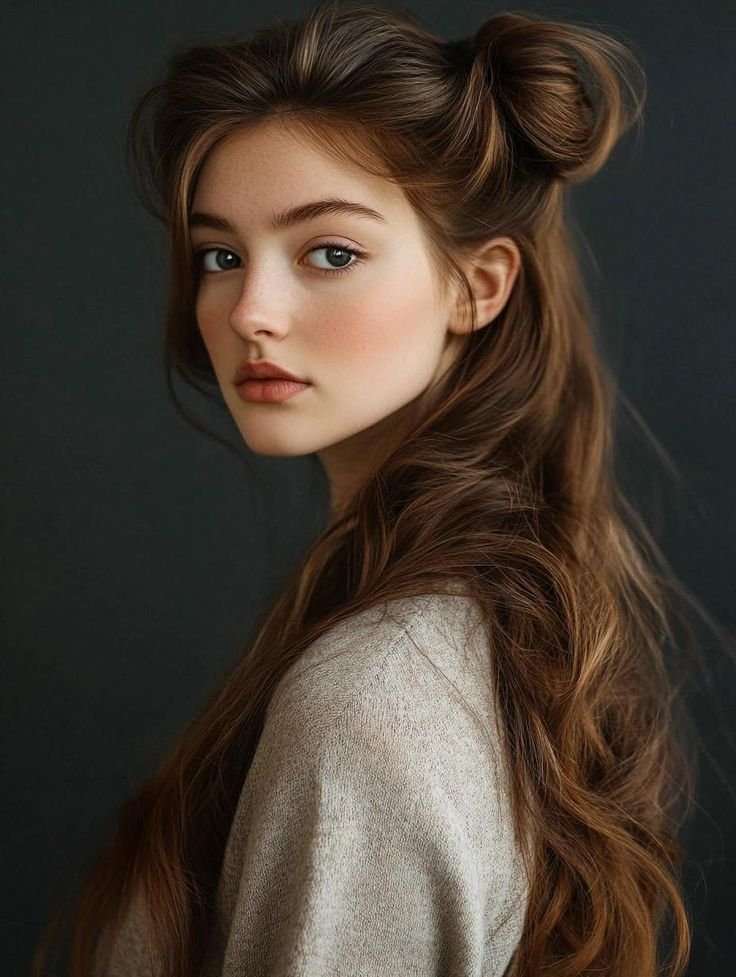 The half-up bun—or “hun”—is playful and flattering. It gives you lift and keeps your hair out of your face.