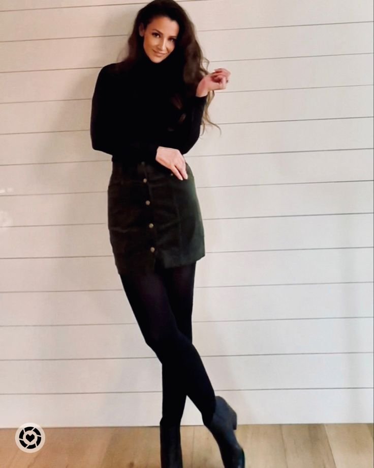 Combine a fitted turtleneck with a plaid or corduroy mini skirt. Add opaque black tights to keep things cozy and stylish. For shoes, go with loafers or Chelsea boots.