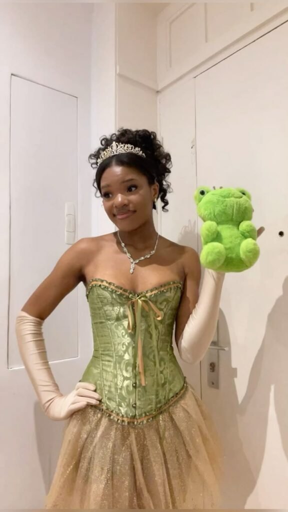 Princess Tiana is the first Black Disney princess, and she represents ambition, strength, and grace. Her signature green gown makes for a stunning costume, but you can also switch it up with a modern twist—a green jumpsuit, crown headband, and frog purse.