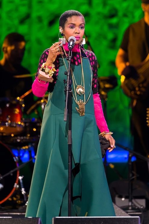 Channel Lauryn Hill with a boho-chic twist: headwrap, oversized denim or earth-tone clothes, layered jewelry, and natural curls or locs. You can carry a record or book of poetry as a prop.