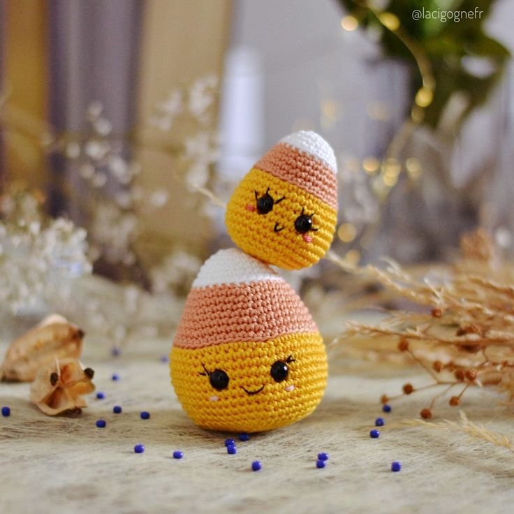 Make mini amigurumi candy corn characters with happy faces, tiny arms, and little Halloween hats. They’re perfect for decorating desks, gifting, or even using as keychains.