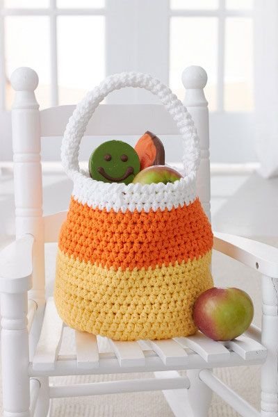 These tri-color baskets are shaped like candy corn and perfect for storing real candy, crochet supplies, or keys and small items. Use yellow, orange, and white yarn and a stiff base to help them stand.