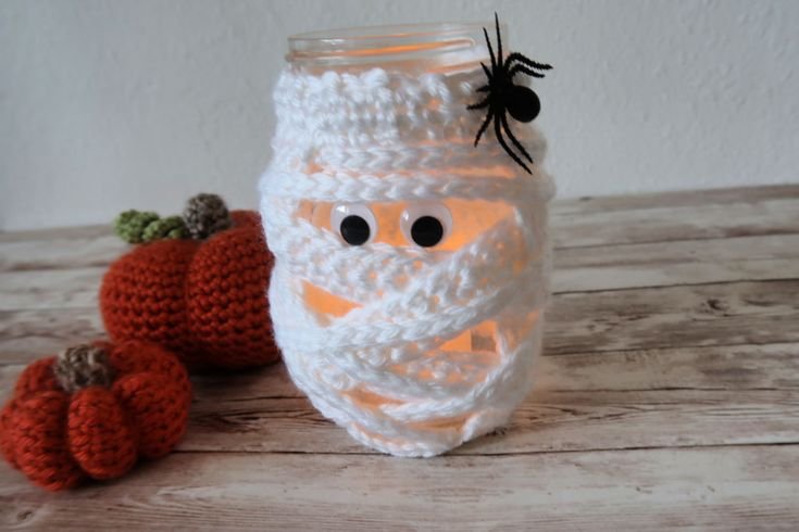 Crochet mummy wraps to slip over mason jars or candle holders. Use white yarn and leave space for a pair of googly eyes to peek through. Add a flickering LED inside for a glowing, haunted effect.