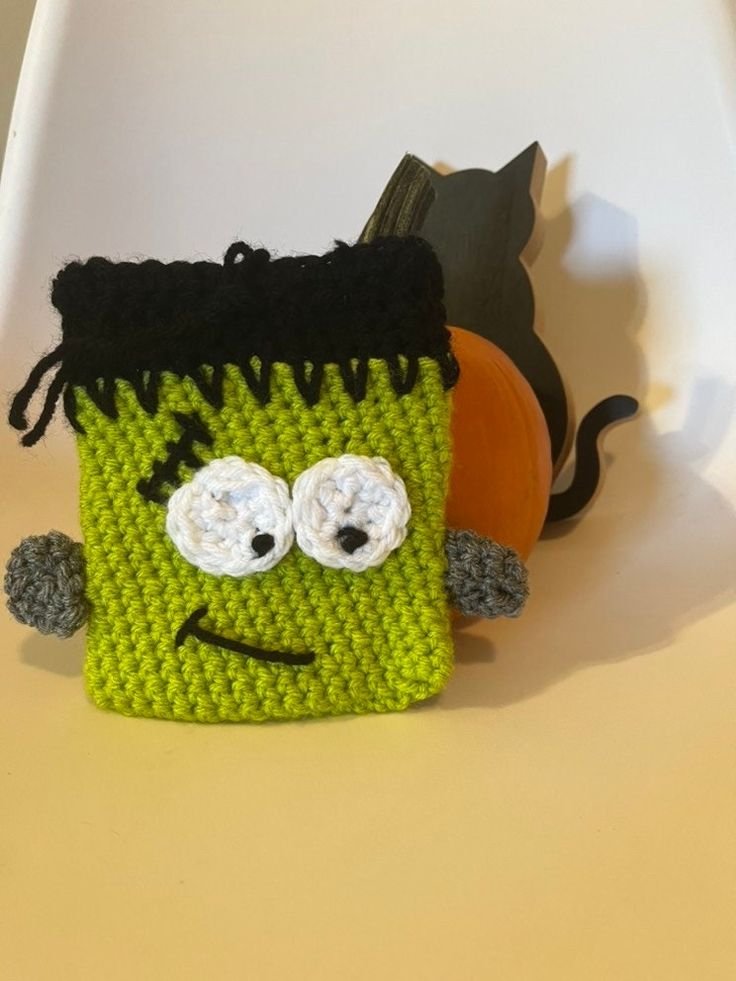 Make small crochet bags in green with black accents, and add some stitched “scars” to bring your Frankenstein monster to life. These can be used by kids for trick-or-treating or handed out as reusable goodie bags.