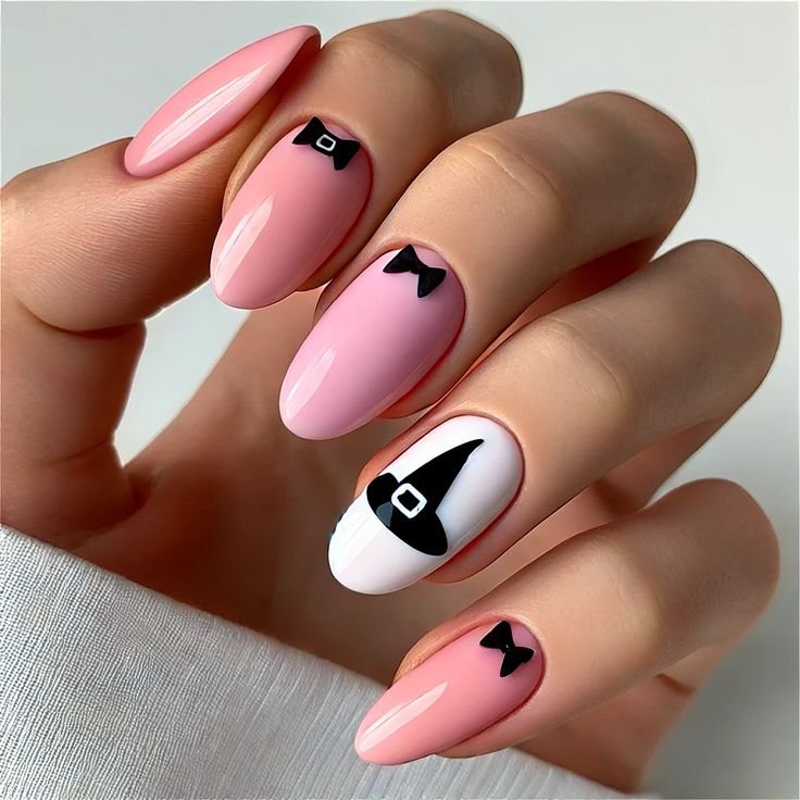 Start with a neutral base like nude, taupe, or soft peach. Then add small Halloween symbols in black or white: a tiny bat, a crescent moon, a mini skull. Keep it simple and clean.