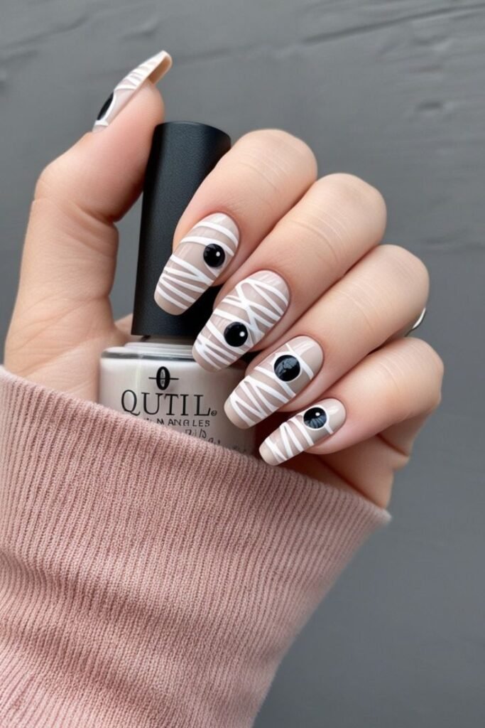 Paint a nude or light gray base, then add white horizontal stripes across the nail. Leave space for two googly eyes or black dots to peek through.