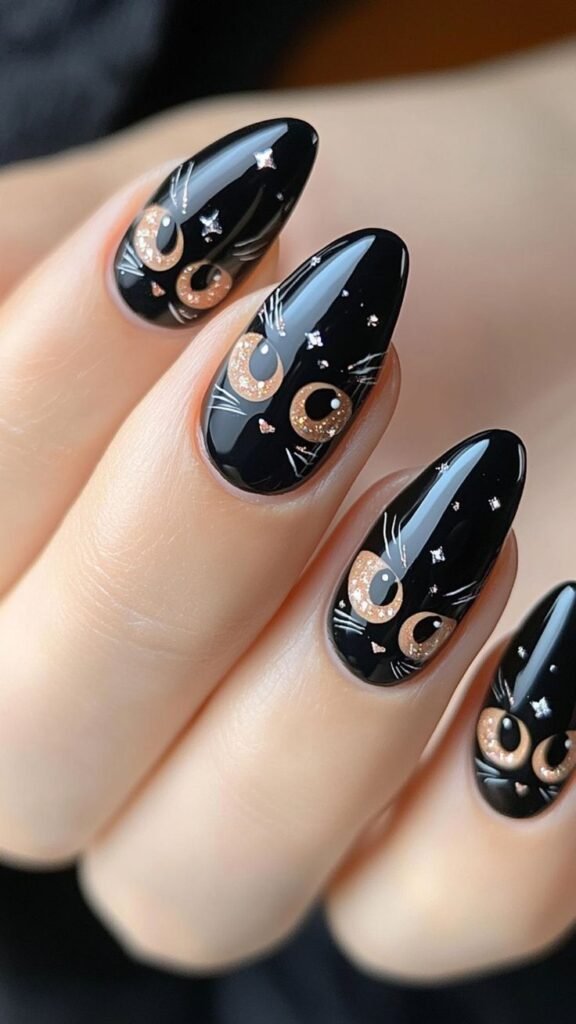 Paint your nails with a deep, glossy black base. Then, on a couple of accent nails, paint simple silhouettes of cats—curved tails, pointed ears, glowing eyes. If you’re not confident in your drawing skills, nail stickers or stencils work wonders.