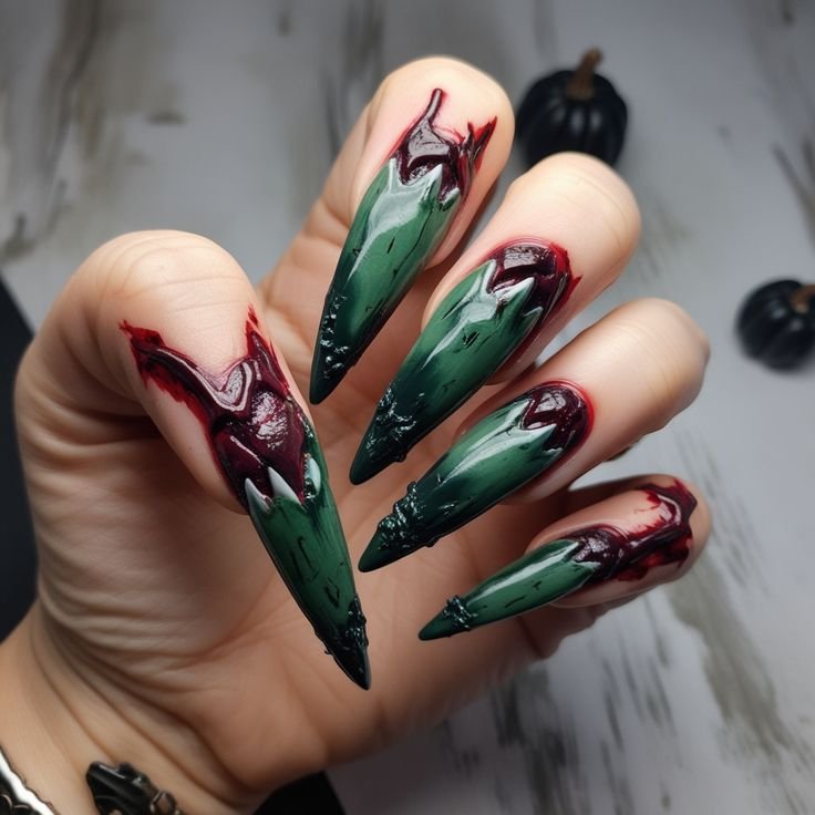 Use green, gray, and maroon polish with a stippling sponge to create a rotting zombie skin effect. Add fake “stitches” with a fine brush for extra gore.