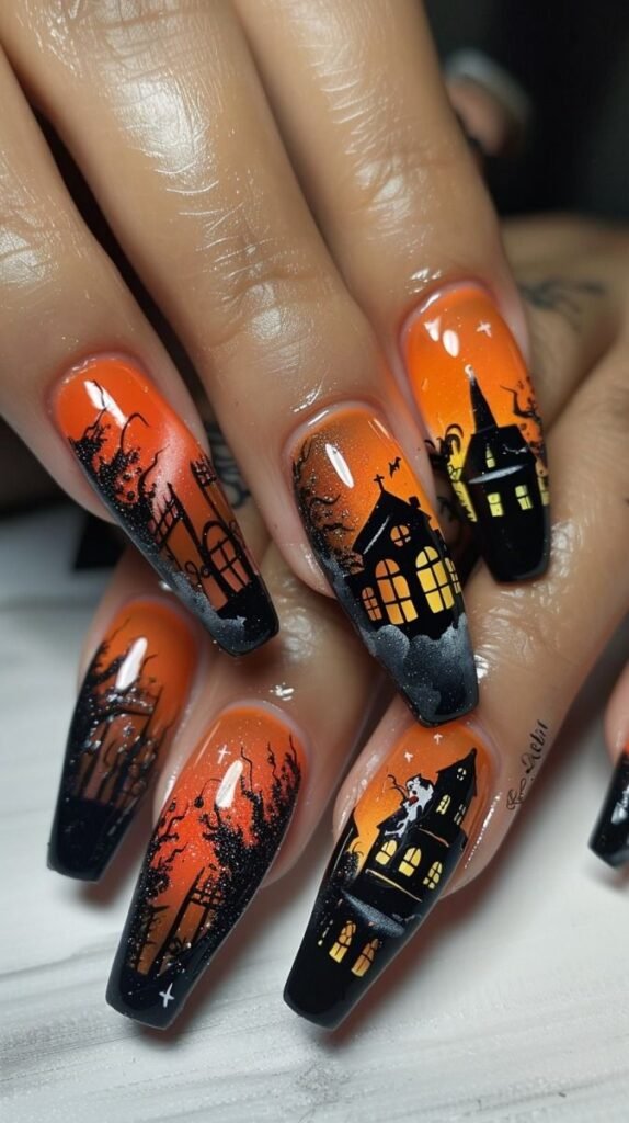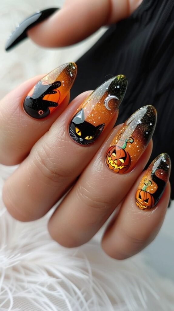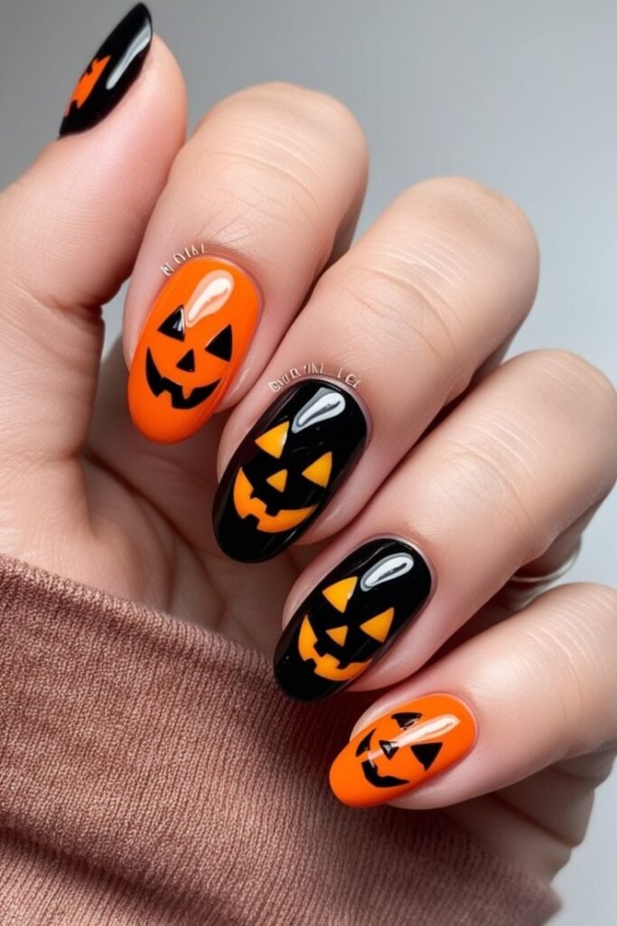 Use a classic Halloween orange for the base color. Then, paint little jack-o’-lantern faces on a few feature nails. Add green swirls or glitter for stems and vines if you’re feeling extra artsy.