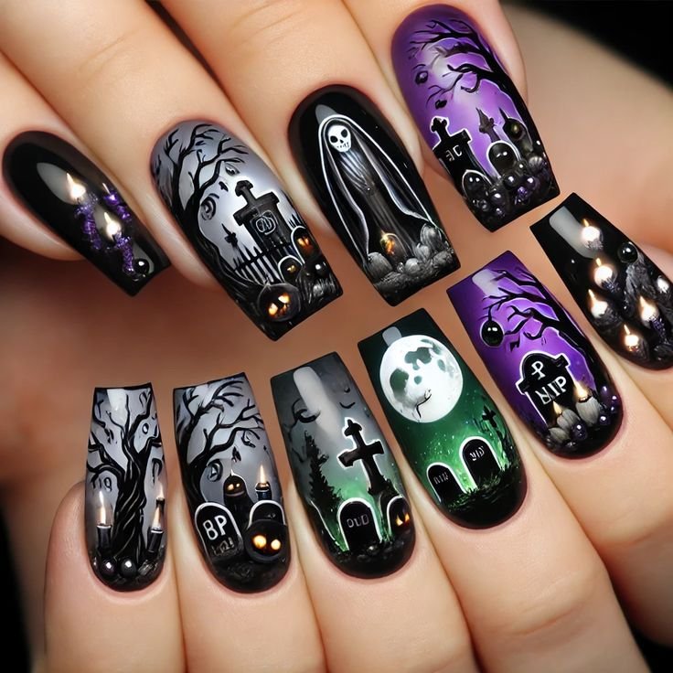 This design mimics a night scene with silhouettes of gravestones, haunted trees, and maybe even a full moon. Start with a gradient base that fades from dark blue to black. Then, use thin brushes to paint the graveyard silhouettes in black or dark gray.