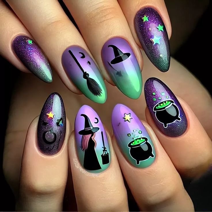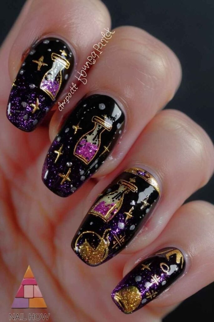 Start with a deep plum or amethyst base. Add bubble-like designs with green, lilac, or glitter polish. You can even add a tiny cauldron or potion bottle accent.