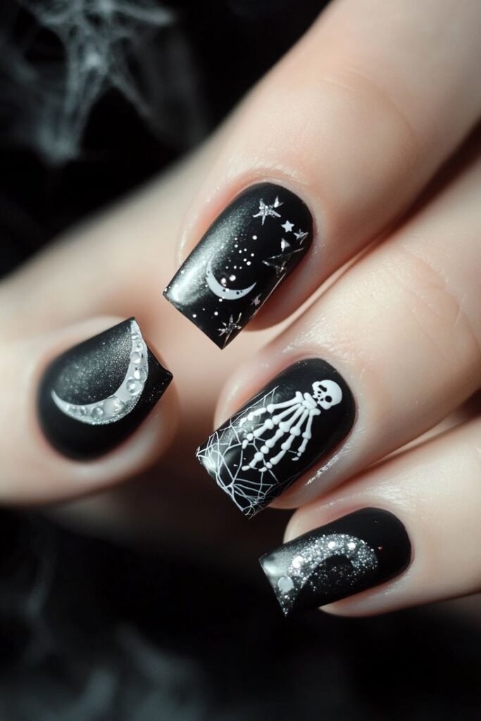 Paint one or two accent nails with tiny white skeleton hand designs reaching across a matte black base. The rest of the nails can stay matte or get a simple French tip for balance.