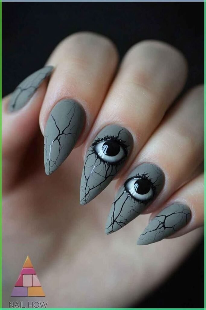 Start with a solid black, purple, or slime-green base. Then paint on little eyeballs—some wide, some sleepy, some looking sideways. Add a glossy topcoat to make them pop.