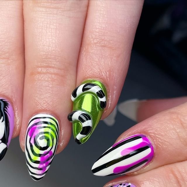 Alternate black and white vertical stripes on each nail, and throw in a green slime accent or purple glitter for extra Beetlejuice flair.