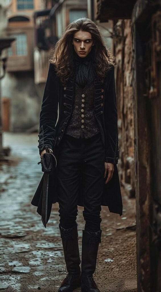 Not your average pirate—we’re talking long coat, velvet vest, tricorn hat, and boots.
