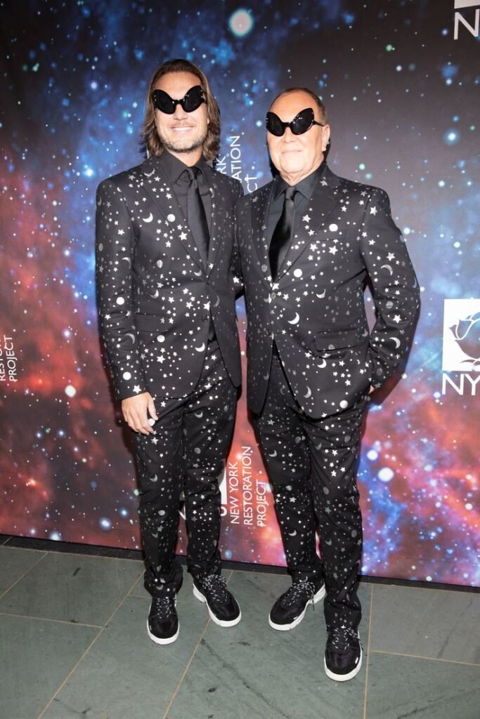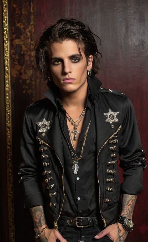 Sequined jacket, leather pants, sunglasses, and a toy mic.