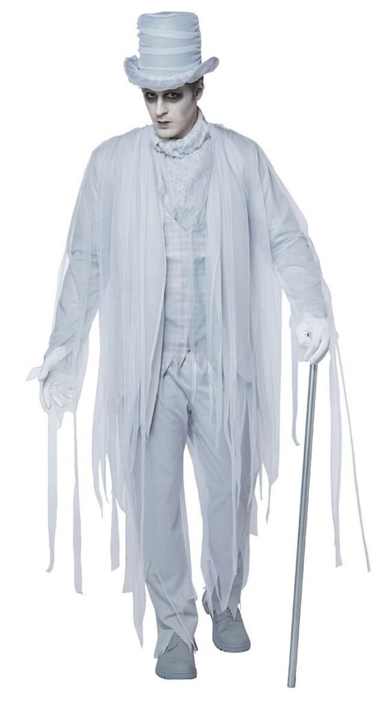 Old-fashioned suit, pale face makeup, dark circles, and a ghostly stare.