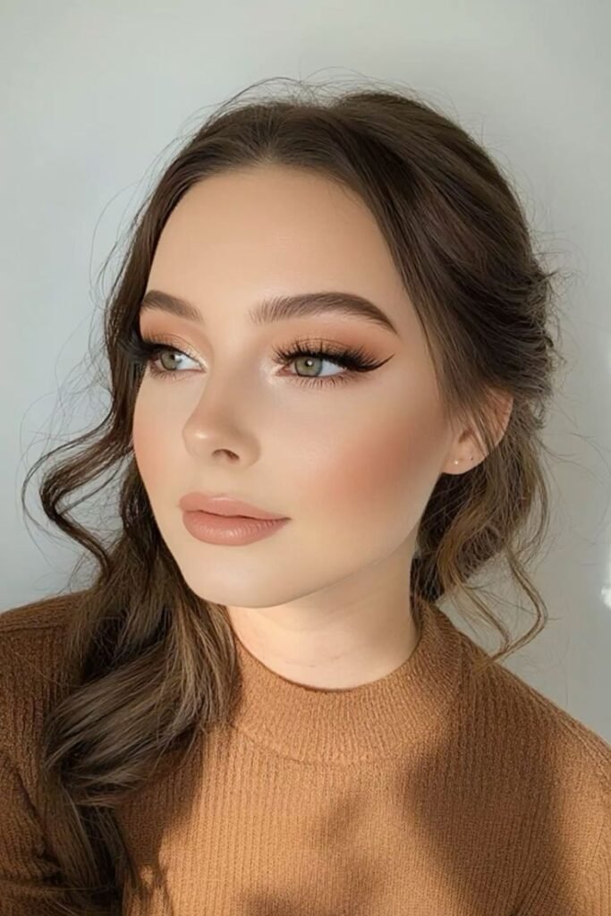 Soft glam is all about smooth blends, muted tones, and natural finishes. Think rose gold lids, feathered brows, flawless foundation, and a peachy-nude lip.