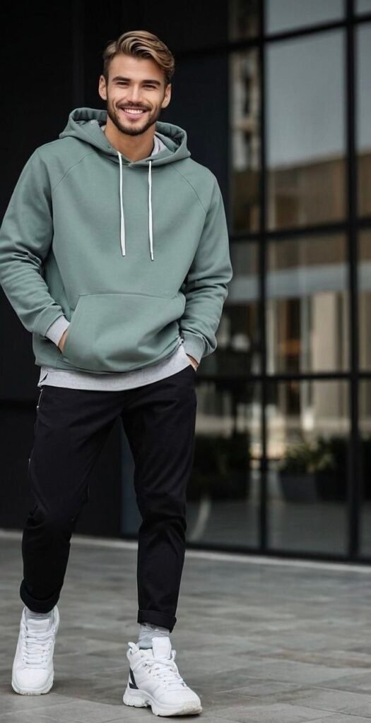 Wear a fitted hoodie under a structured overcoat or trench. Pair with slim pants and sleek boots.