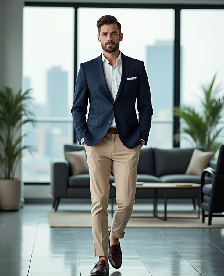 A button-down shirt, tailored trousers, and a blazer create that polished-but-not-too-formal look.