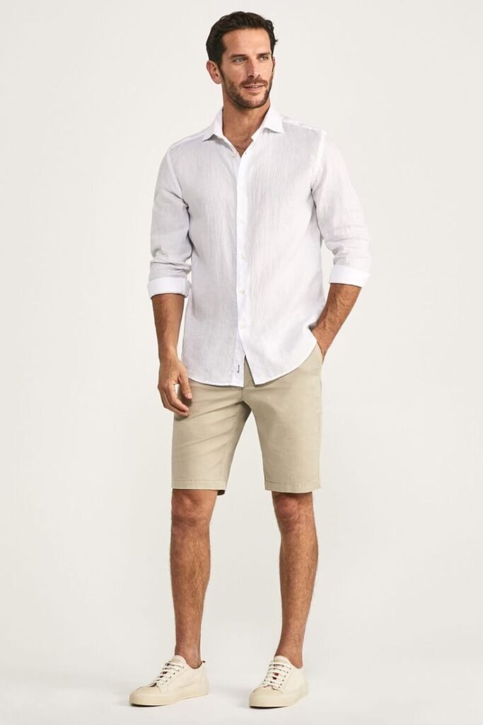 Hot weather calls for breathable fabrics. A linen shirt—short or long-sleeve—paired with tailored shorts is ideal.