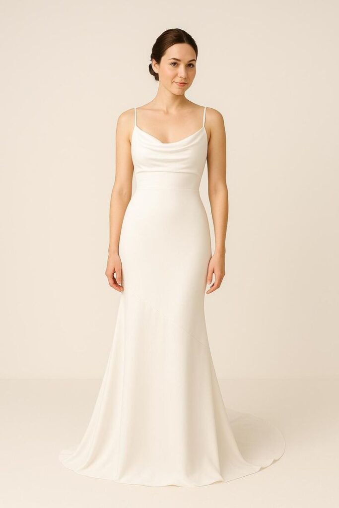 A satin slip dress hugs your figure softly and flows like water. The clean lines and subtle shine make it a chic choice for modern brides. Add delicate strappy heels and a bold lip for a high-fashion finish.