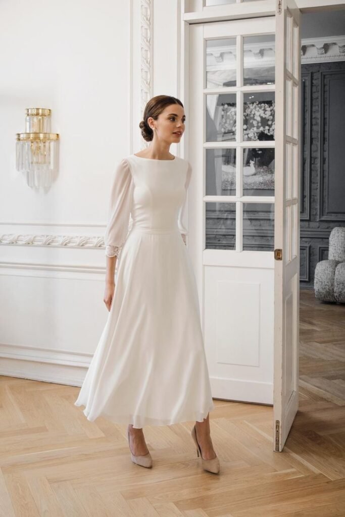 Tea-length dresses bring a vintage vibe while keeping it modern. Ideal for civil ceremonies or receptions, they offer comfort and movement.