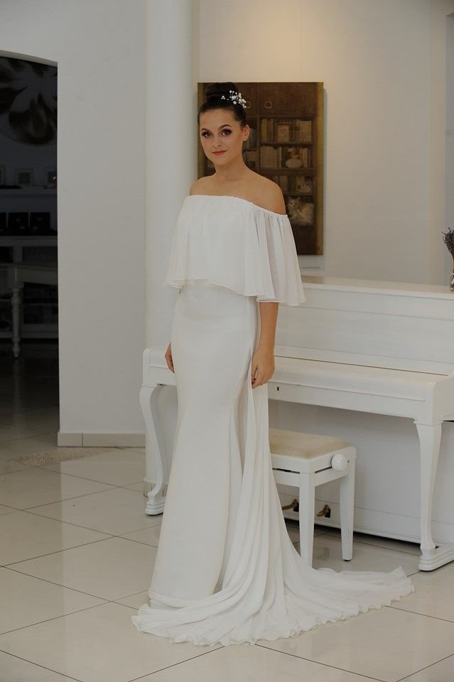 An off-the-shoulder neckline adds softness without excess detail. Whether you choose a fitted column dress or an A-line silhouette, the exposed shoulders offer feminine charm.