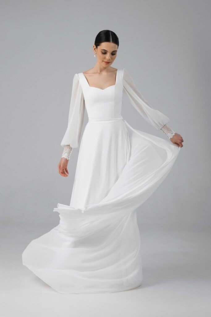 A long-sleeved minimal gown exudes timeless sophistication. Think Meghan Markle vibes: clean silhouette, high-quality fabric, and classic tailoring.