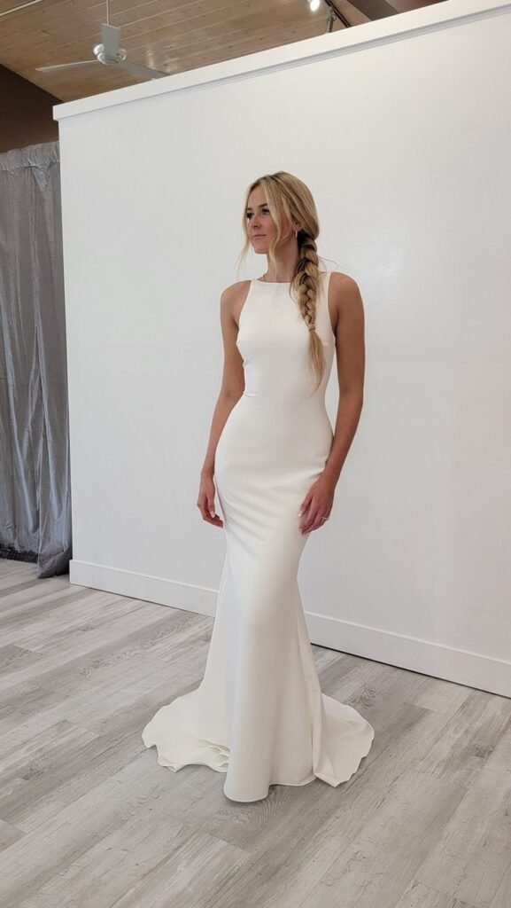 A high-neck wedding gown offers modesty with a fashion-forward edge. Opt for matte crepe or silk to keep it sleek. These dresses often need minimal accessories.