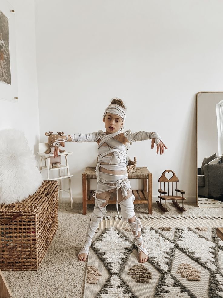 For kids or kid-themed events, a cute mummy look works wonders. Soft gauze wraps, white leggings, and a long-sleeved shirt form the base. Avoid dark makeup—use face paint to create a happy expression instead.
