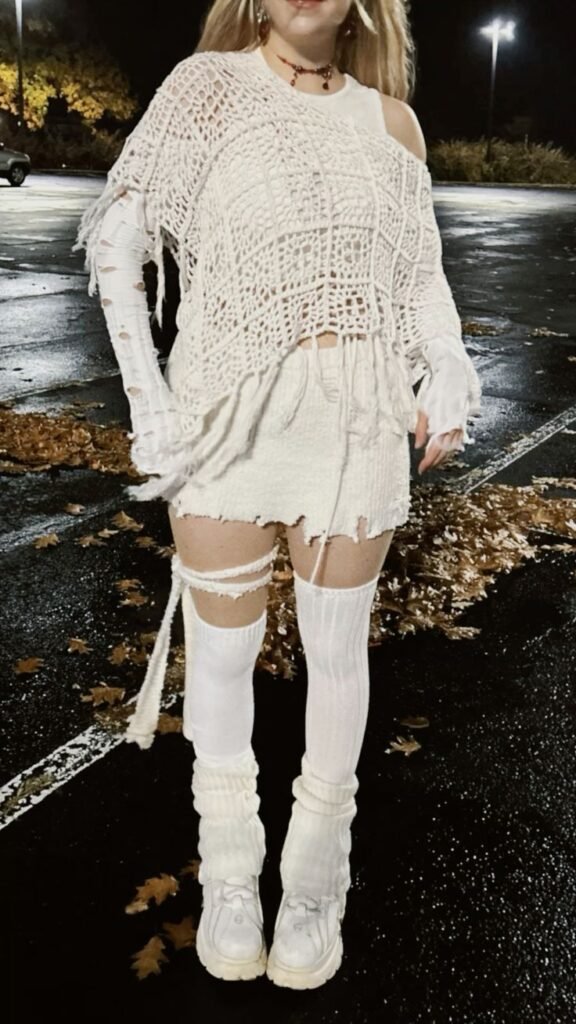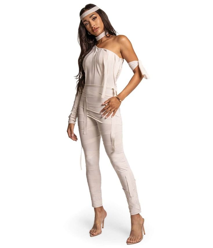 Create a party-ready mummy look using white mesh or stretchy wraps mixed with glow-in-the-dark or glitter elements. Use face gems, metallic body paint, and even LED accessories.
