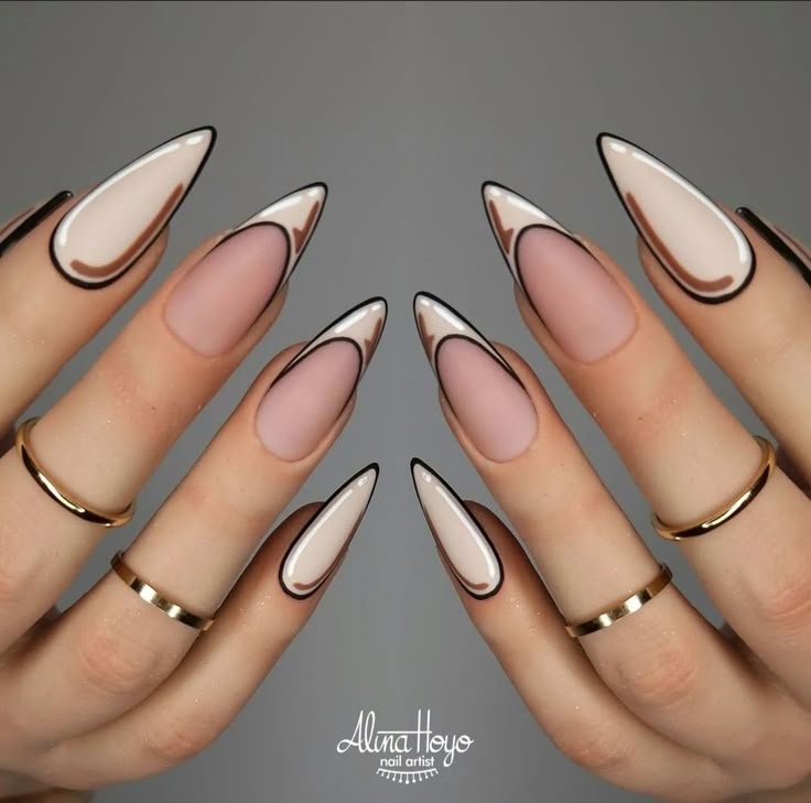 Popular combinations include nude with metallic gold, white with bold red, or even pastel shades for a softer look. This design adds an unexpected and stylish touch to a traditional manicure.