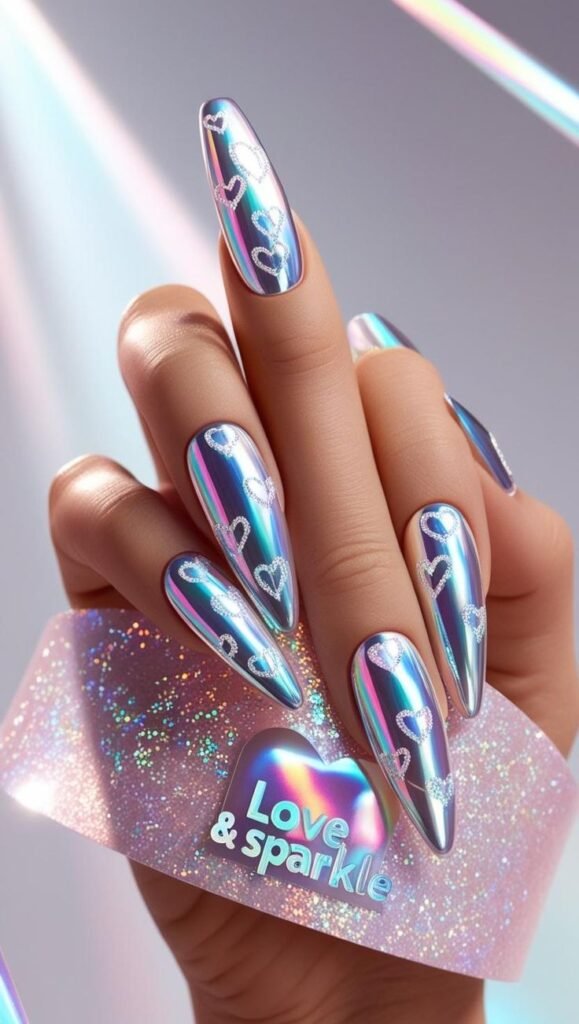 If you love futuristic and eye-catching nails, holographic nails are a must-try. This trend features a dazzling, color-shifting effect that reflects different hues depending on the light.