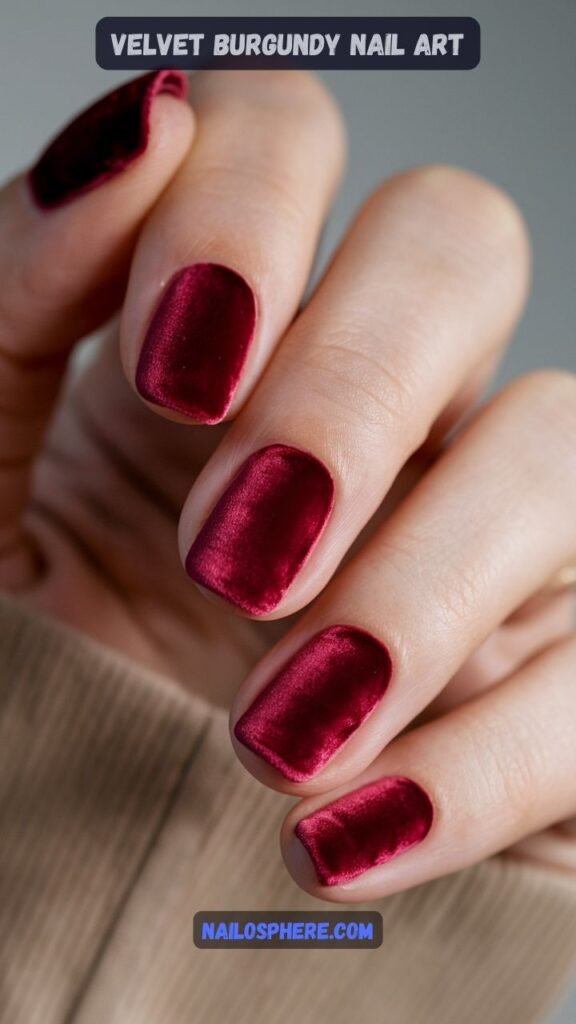 Velvet nails are all about soft, shimmering textures that resemble luxurious fabric. This trend uses special reflective pigments to create a plush, velvet-like effect that changes with the light.