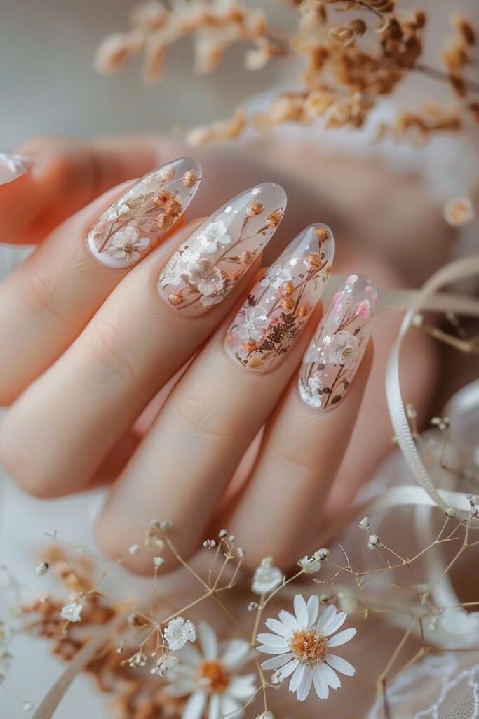 Floral pressed nails feature real dried flowers embedded in a clear or nude base, creating a delicate and botanical-inspired look. This trend embraces natural beauty and soft, feminine designs.