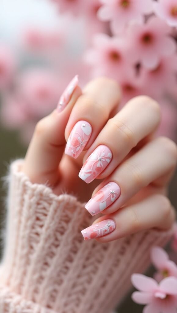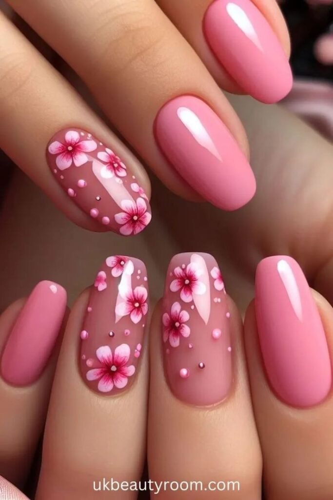 Add dainty flowers in white or pastel colors over a pink base. Floral nail art feels delicate and perfect for spring, weddings, or garden parties.