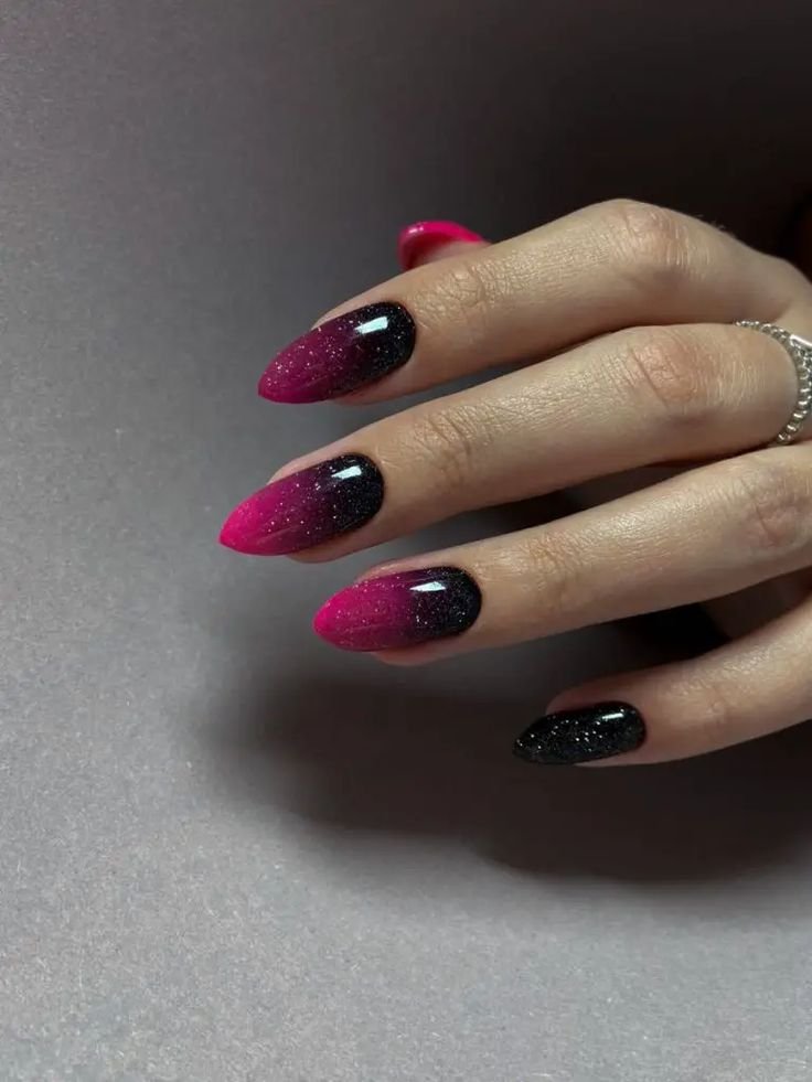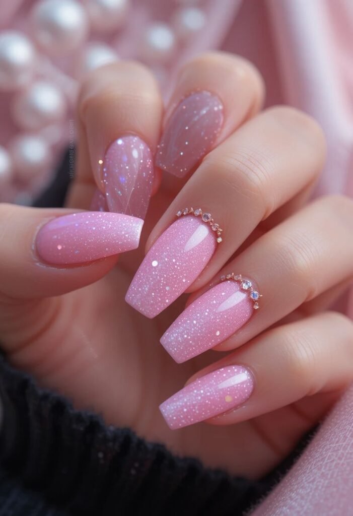 A gradient that fades from pink to shimmer or glitter gives your nails a dreamy, magical touch. Think of it like a sunset on your fingertips.