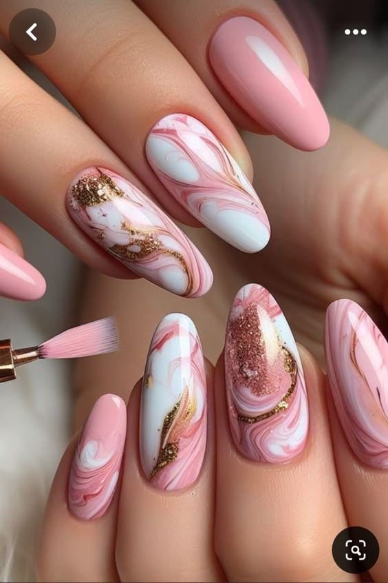 Marble nails in shades of pink add elegance and uniqueness to your manicure. The swirls and textures mimic real marble and look stunning up close.