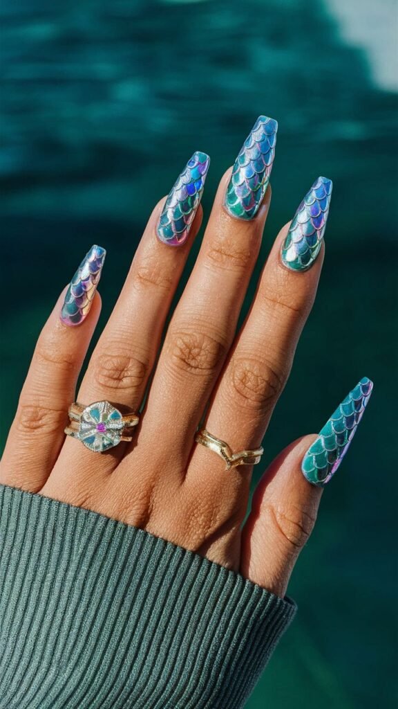 Paint your base with a light aqua or turquoise, then use a nail stencil or fine brush to create scale patterns with chrome or glitter polish.