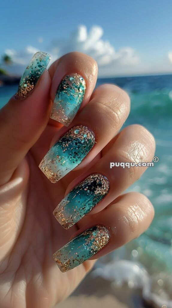 Use a deep blue or teal polish and blend glitter from the tip downward. Use silver, aqua, or holographic glitters to mimic the way sunlight hits water.