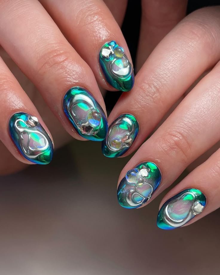 Apply aqua or teal polish and dust chrome powder over the top. Buff it to a smooth shine for a slick, mermaid-inspired finish.