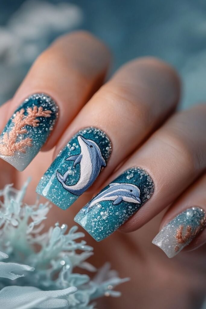 Use a mid-tone ocean blue base and layer it with fine silver glitter. Add a dolphin sticker or hand-paint one for a fun, beachy touch.