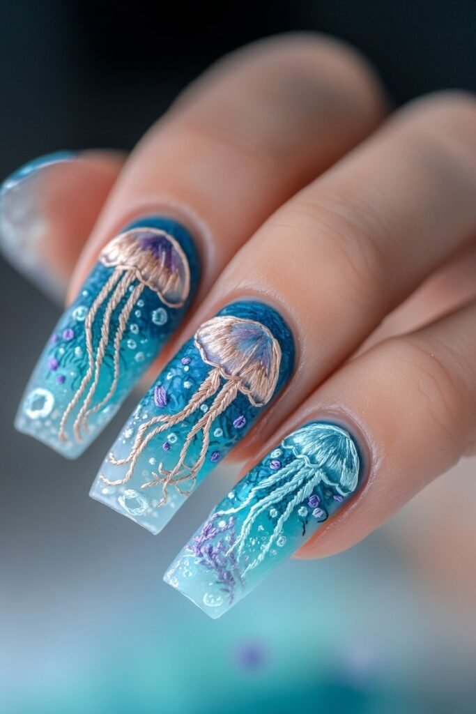 Try translucent pinks or purples as a base and add jellyfish-style streaks using white or soft neon lines. Finish with shimmer or iridescent topcoat.